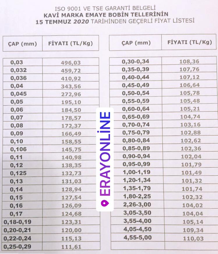 15 Temmuz 2020 Kavi Emaye Bobin Teli Fiyat Listesi